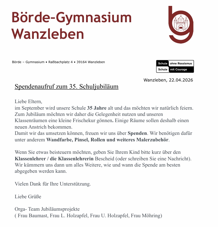 • Save the date…am 04.09.2026 findet zum 35. Geburtstag des Börde-Gymnasiums Wanzleben ein Absolvententreffen statt. Eingeladen sind alle Absolventen der letzten Jahrzehnte. Weitere Informationen folgen demnächst.