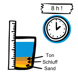 Die Erde setzt sich in Schichten ab. Zuerst die großen Teilchen, später die kleinen und kleinsten: Sand nach 5 Minuten. Schluff nach einer Stunde. Tonteilchen etwa 8 Stunden. Messt mit einem Lineal die Schichtdicken und die Gesamtdicke. Notiert diese Ergebnisse.