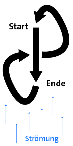 Zieht die Wathose an und geht an einer Stelle mit sicherem Halt in den Fluss. Zieht den Kescher mehrmals in Form einer Acht durch das Wasser. Dabei sollte der erste und letzte Zug gegen die Stromrichtung erfolgen (siehe Abbildung).