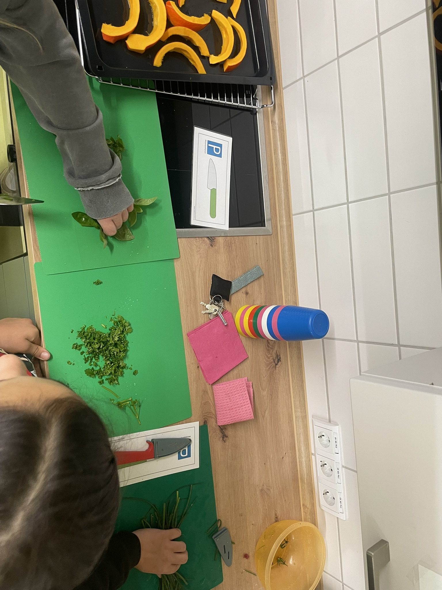 Wir nutzten den September, um gemeinsam unsere Ernte zu verarbeiten und uns leckere Gerichte in unserer neuen Schülerküche zu zaubern: Wir kochten und aßen Nudeln mit selbstgemachter Tomatensoße und Ofengemüse (aus vielen Kartoffeln, Kürbis, Möhren, Pastinake und Zwiebeln) mit Kräuterquark.