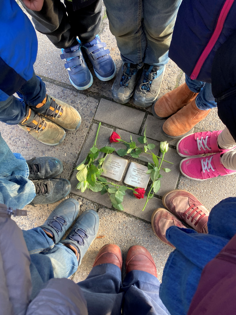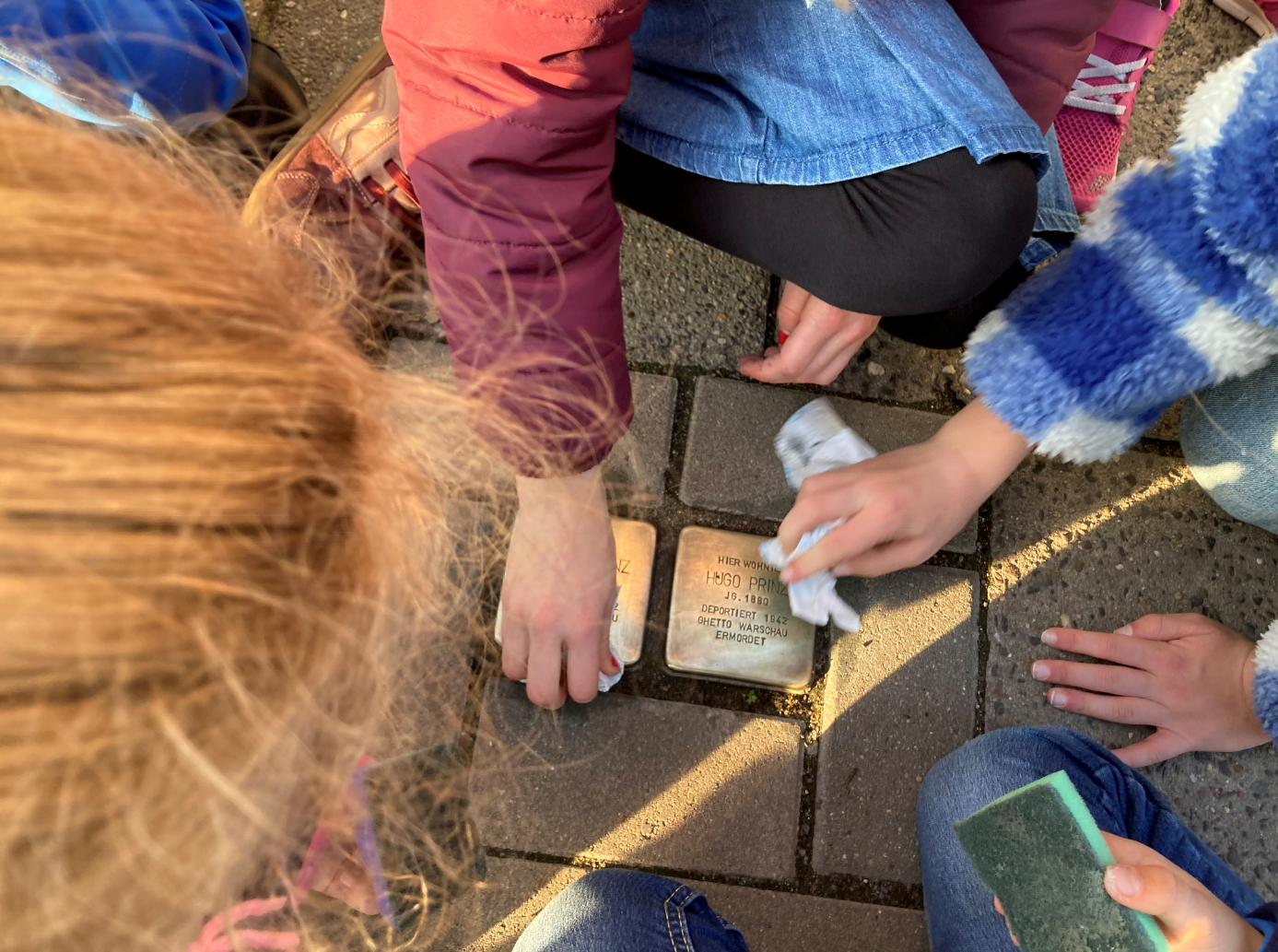 Am Montag, 10.11., machten sich 17 Schülerinnen und Schüler aus unserer Schule auf zur Großen Diesdorfer Straße, um erstmals unsere Paten-Stolpersteine des Ehepaares Prinz zu putzen. Der Zeitpunkt war nicht ganz zufällig gewählt, jährte sich die Reichsprogromnacht einen Tag zuvor zum 87. Mal. Zum Gedenken an all die Opfer wurden daher bereits am Sonntag viele, viele Steine in Magdeburg zum Glänzen gebracht, sodass man unwillkürlich darüber „stolpern“ muss, wenn man an ihnen vorbei oder darüber hinweggeht. Damit sich nicht alle Kinder um „unsere“ zwei Steine drängen mussten, ging Herr Wetzel, ehrenamtliches (und sehr engagiertes) Mitglied der städtischen Arbeitsgruppe „Stolpersteine für Magdeburg“ und enger Kooperationspartner unserer Schule, mit der Hälfte der Kinder ca. 200m weiter, wo seit diesem Sommer zwei Stolpersteine für das Ehepaar Dr. Moser liegen. Gemeinsam putzten die Kinder somit vier Steine und der Unterschied vorher/nachher war beeindruckend. „Da möchte man jetzt gar nicht mehr drauftreten, so schön wie die glänzen!“ fasste eine Schülerin das Ergebnis der Putzaktion zusammen. Und so soll es auch sein. Nicht mehr einfach drauftreten oder darüber hinweggehen. Im Besten Fall bleibt man stehen, liest und denkt darüber nach, wofür diese Steine stehen und dass so etwas nie wieder passieren darf…