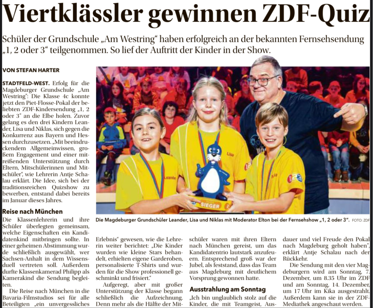 Fußball trifft KulturFolgende Mannschaften traten an:Grundschule "Am Umfassungsweg" - 1. FC Magdeburg, Grundschule "Am Nordpark", Grundschule "Moldenstraße", Grundschule Rothensee, Grundschule Friedenshöhe, Union Berlin, Eintracht Braunschweig und wir, die Grundschule "Am Westring".Ein wirklich schönes und faires Fußballturnier und wir haben gewonnen. Das Endspiel fand gegen Union Berlin statt und wurde im 7-Meter-Schießen entschieden. Dank unseres genialen Torhüters gewannen wir das Turnier und unser Torhüter wurde als bester Torhüter ausgezeichnet. Herzlichen Glückwunsch. Wir sind sehr stolz auf unsere Mädchen und Jungs, die beim Turnier alles gegeben haben. Super!!!