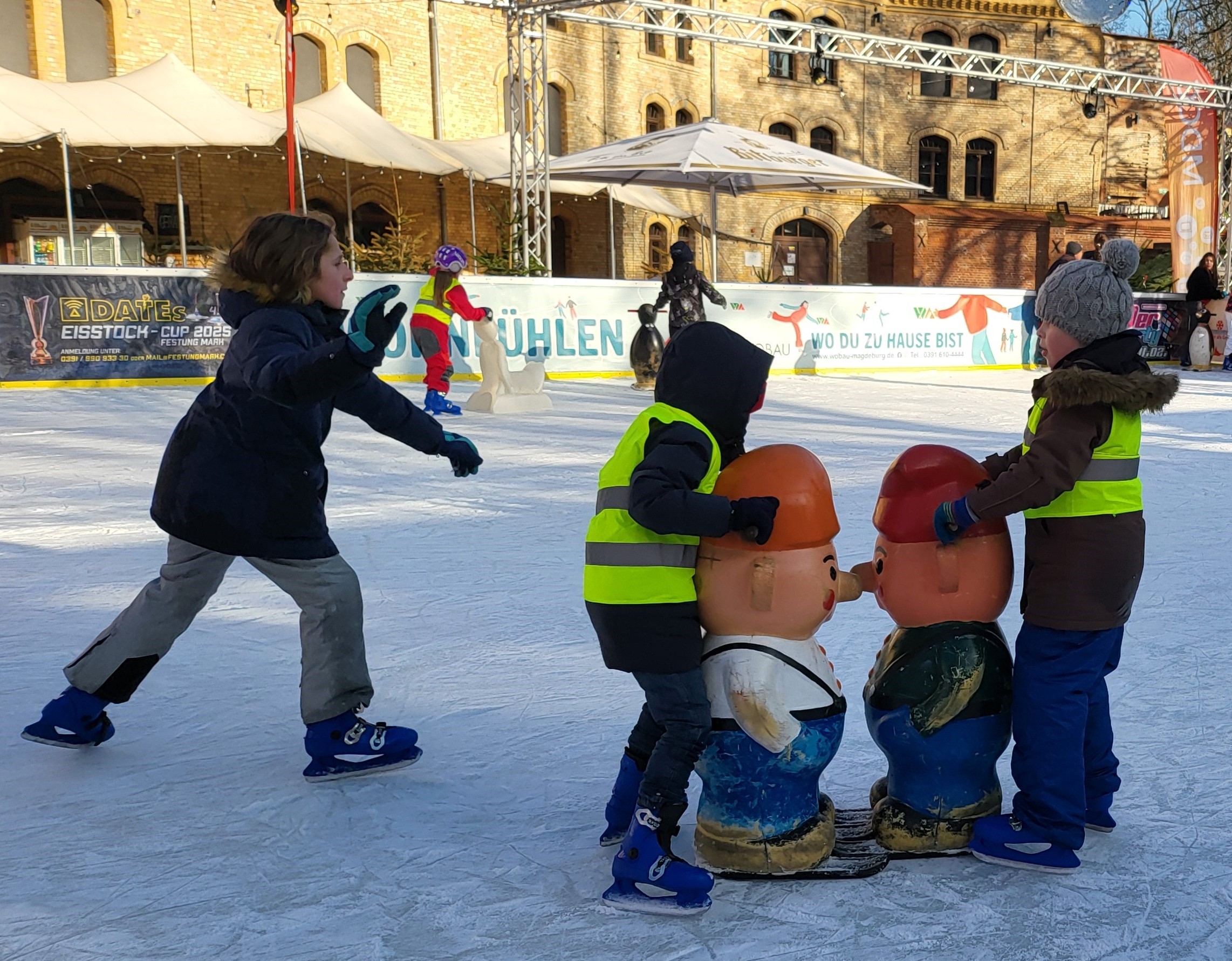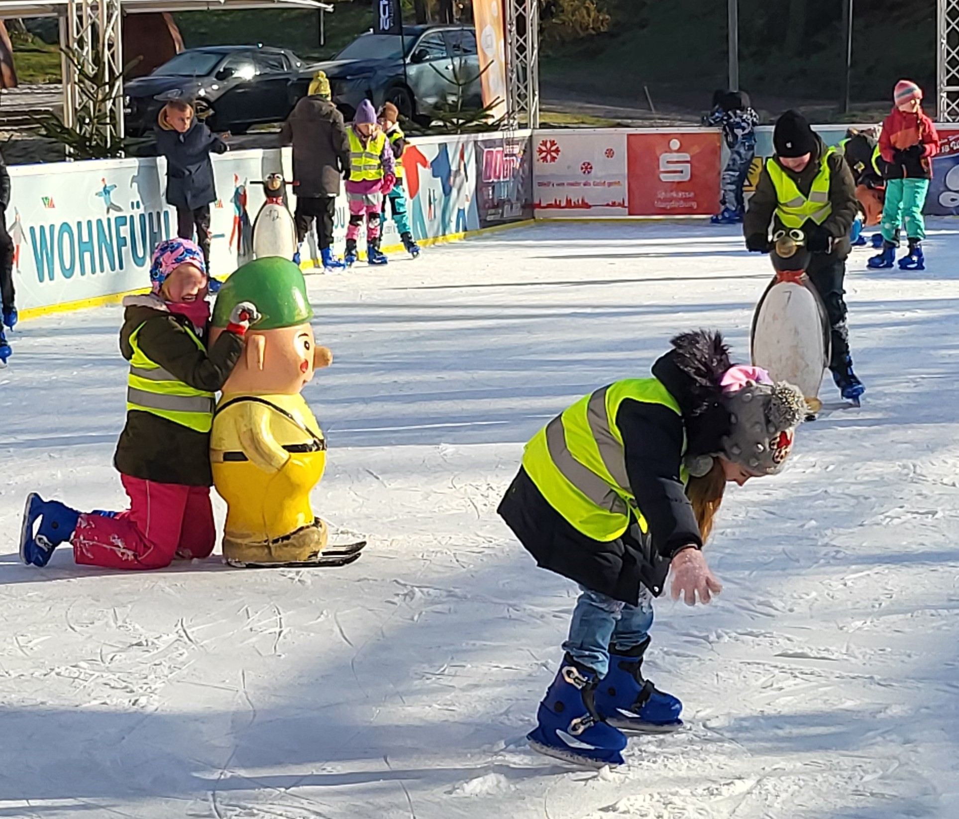 Wir waren ausgesprochen stolz, aber nicht überrascht von ihnen, denn es gab nur eine Handvoll, die sich nicht so recht überwinden konnten, aufs Eis zu gehen. Alle anderen tummelten sich frohgemut und unverdrossen kraftvoll oder mit Anmut und Grazie ununterbrochen auf dem Eis. Da gab keiner auf und jeder hatte jederzeit eine helfende Hand (oder einen Pinguin oder Zwerg).