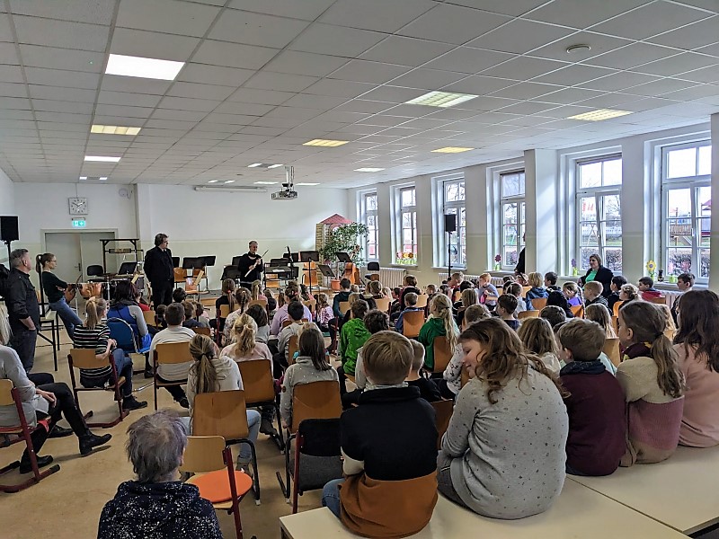 Endlich war es soweit: Die Mitteldeutsche Kammerphilharmonie kam zu uns in die Schule und führte Prokofjews Musikmärchen "Peter und der Wolf" bei uns und MIT uns auf. Unsere Musiklehrerin Frau Rochow bereitete unsere Kids schon seit Wochen vor, und so wussten alle über die Rollen Bescheid! Die einzelnen Instrumente wurden nicht nur klanglich vorgestellt und danach genossen wir gemeinschaftlich ihr Zusammenspiel.