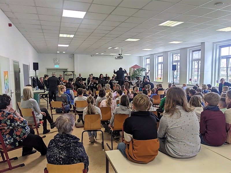 Es ist fast unglaublich, dass so etwas überhaupt möglich ist: 23 Musiker versammeln sich in unserer Mensa und spielen ein Konzert - mit derselben Inbrunst wie im realen Konzerthaus! Wir bedanken uns von Herzen bei den Mitgliedern der Mitteldeutschen Kammerphilharmonie: Die Vorstellung war kurzweilig und einfach märchenhaft schön .