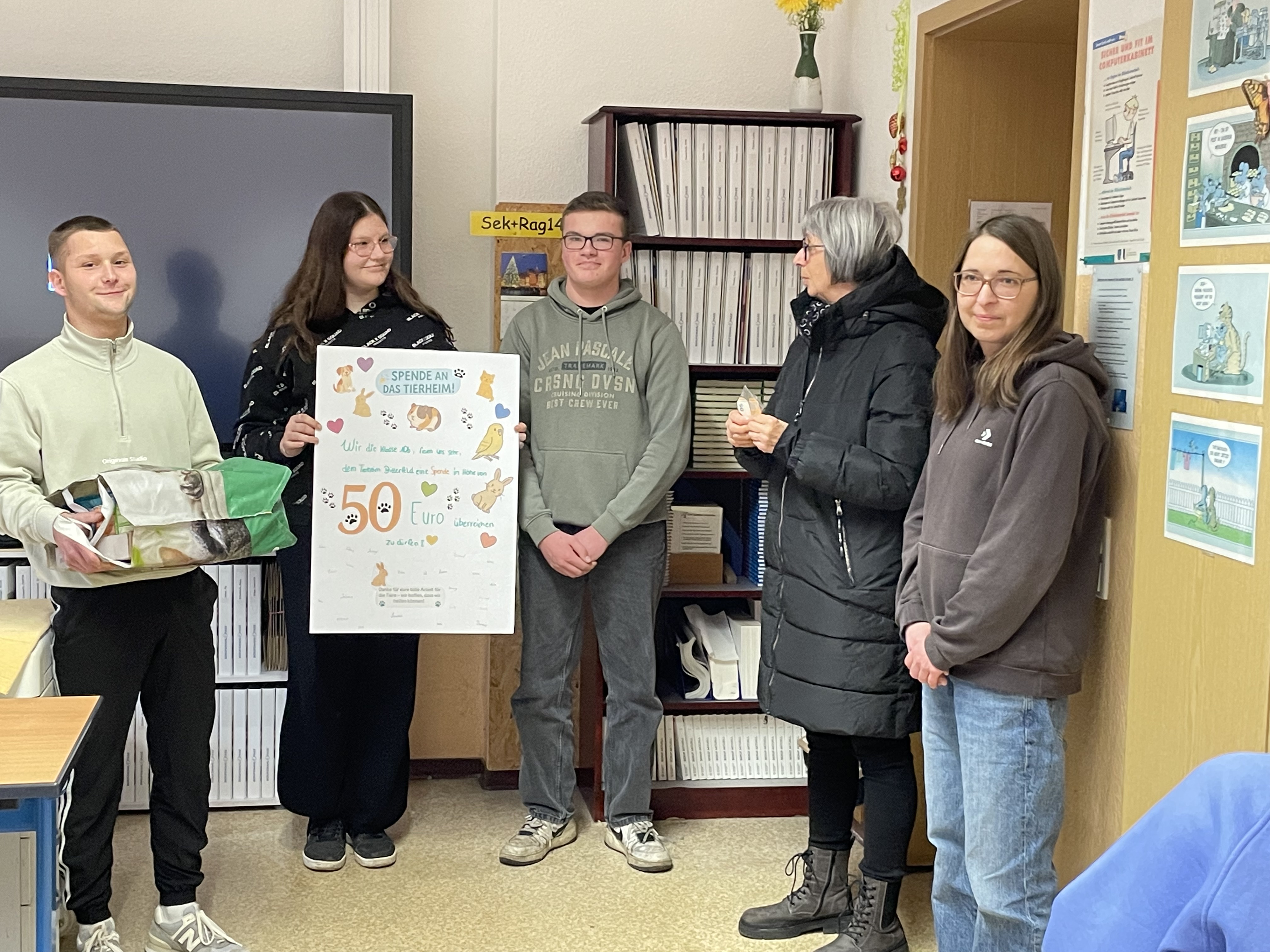 Kurz vor Weihnachten zeigte die Klasse 10b großes Herz für Tiere: Unter dem Motto „Auch was für unsere Tiere“ sammelten die Schülerinnen und Schüler Spenden für das Tierheim Bitterfeld.