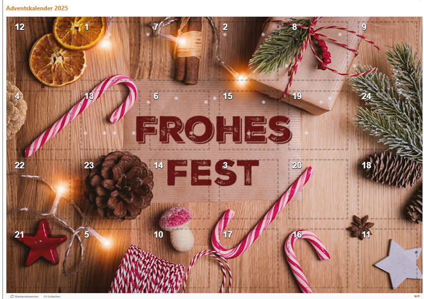 Willkommen zum vierten schuloffenen Adventskalender. Hier warten ab 1. Dezember 24 Fragen zum Thema: Weihnachtszeit - Vorfreude, schönste Freude? Wer weiß am meisten über weihnachtliche Traditionen, Begriffe und Statistiken? Die Fragen müssen nach der Öffnung innerhalb von 3min beantwortet werden und stehen auch jeweils nur am aktuellen Tag zur Verfügung! Wollen auch sie als Gast mitspielen? Dann bitten Sie um Zugangsdaten unter: a.rosenthal@sekundarschule-raguhn.de oder c.fisch@sekundarschule-raguhn.de