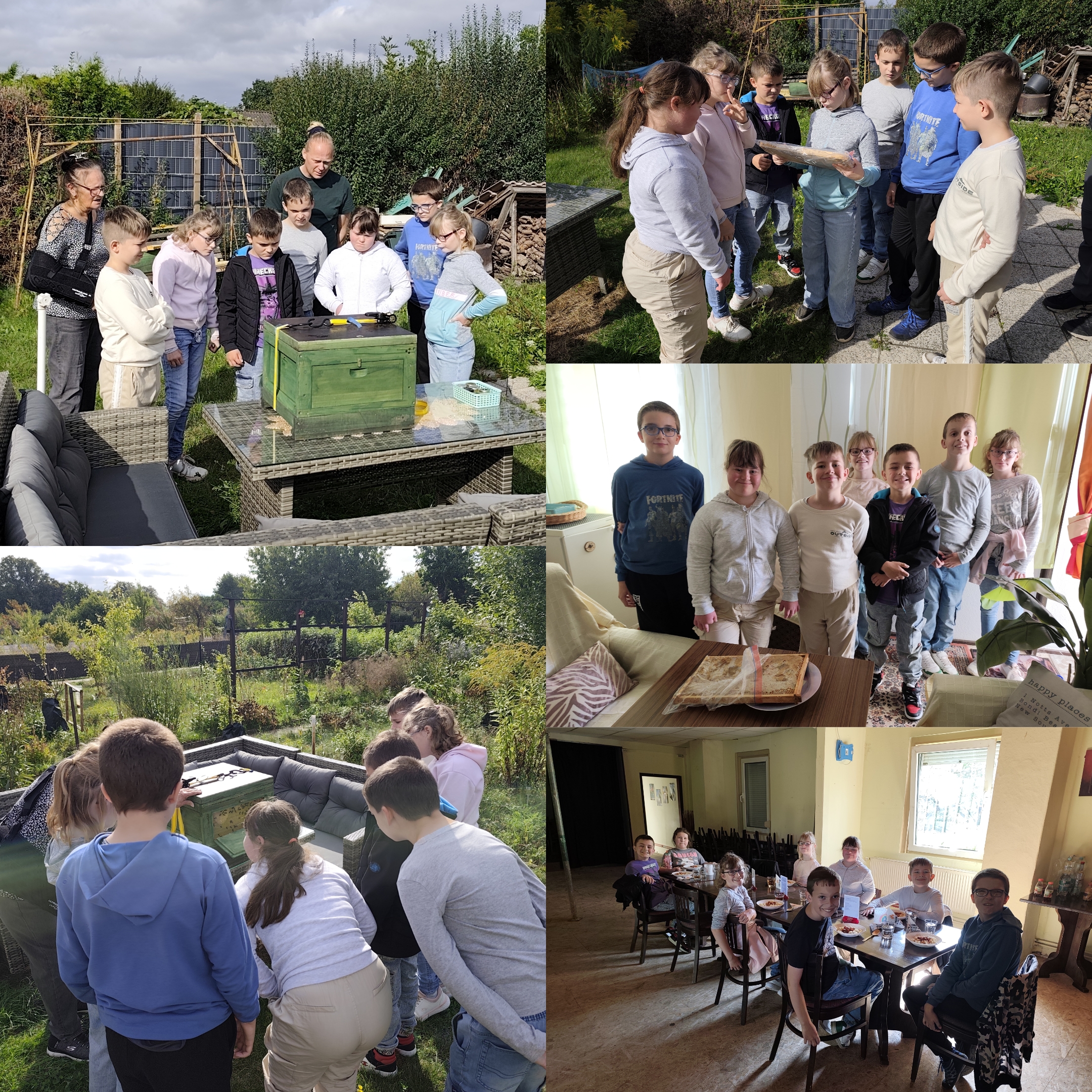 Am 19.09.2025 besuchte die Klasse M5 die Bienenzüchterin Angela Seiffert in der Gartenanlage „Naturfreunde“ in Sudenburg. Nach einem kurzen theoretischen Input ging es direkt zu einem Bienenstock, bei dem zahlreiche Bienen bestaunt werden durften. Danach durften die SchülerInnen einen wirklich schweren Rahmen in die Hand nehmen und dabei die Wabenstruktur bestaunen. Das anschließende Auskratzen und Verkosten des Honigs löste pure Begeisterung aus. Jedes Kind durfte am Ende noch ein kleines Glas Honig mit nach Hause nehmen. Den Abschluss des Ausfluges stellte ein gemeinsames Mittagessen vor Ort dar, welches Frau Muhl (Mama von Loic) liebevoll für uns zubereitet hatte.