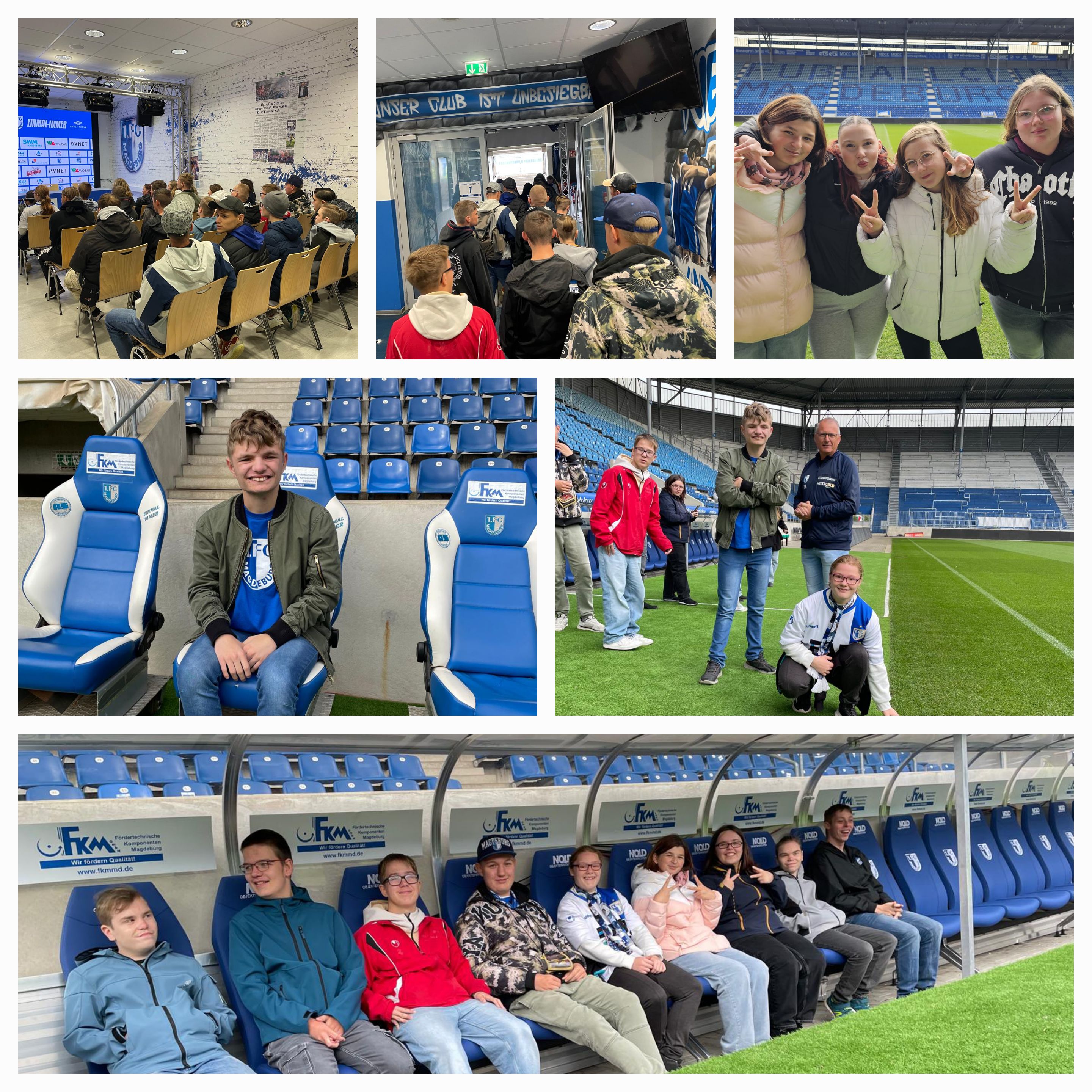 Am 26.09.2025 durfte die Berufsschulstufe einen ganz besonderen Ausflug machen: Wir haben das Stadion des 1. FC Magdeburg besichtigt! Gemeinsam erkundeten wir den VIP-Bereich, den berühmten Block U und den Spielertunnel. Auch im Pressraum durften wir Platz nehmen und sogar einen Blick in die Kabine der Gastmannschaft werfen. Ein echtes Highlight war, dass wir den heiligen Rasen anfassen durften. Dieses tolle Erlebnis werden wir so schnell nicht vergessen!