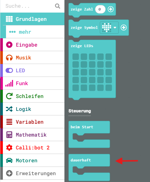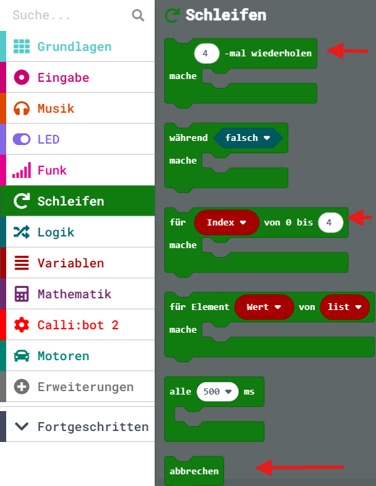 In der Programmierumgebung Makecode stehen uns verschiedene Schleifen zur Verfügung: